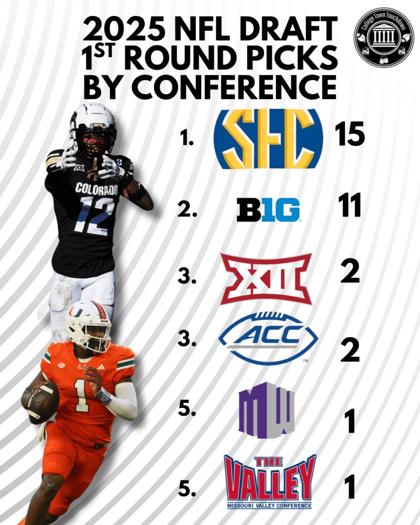 The SEC has had the most players drafted in the first round since 2000 by a wide margin. The 2025 NFL Draft was no different. Though the addition of Texas was certainly a boost, the conference still dominated the first round with 15 players picked. The Big Ten was second this year in first round picks with 11 players picked, also receiving a boost with one of their newest members, the Oregon Ducks.